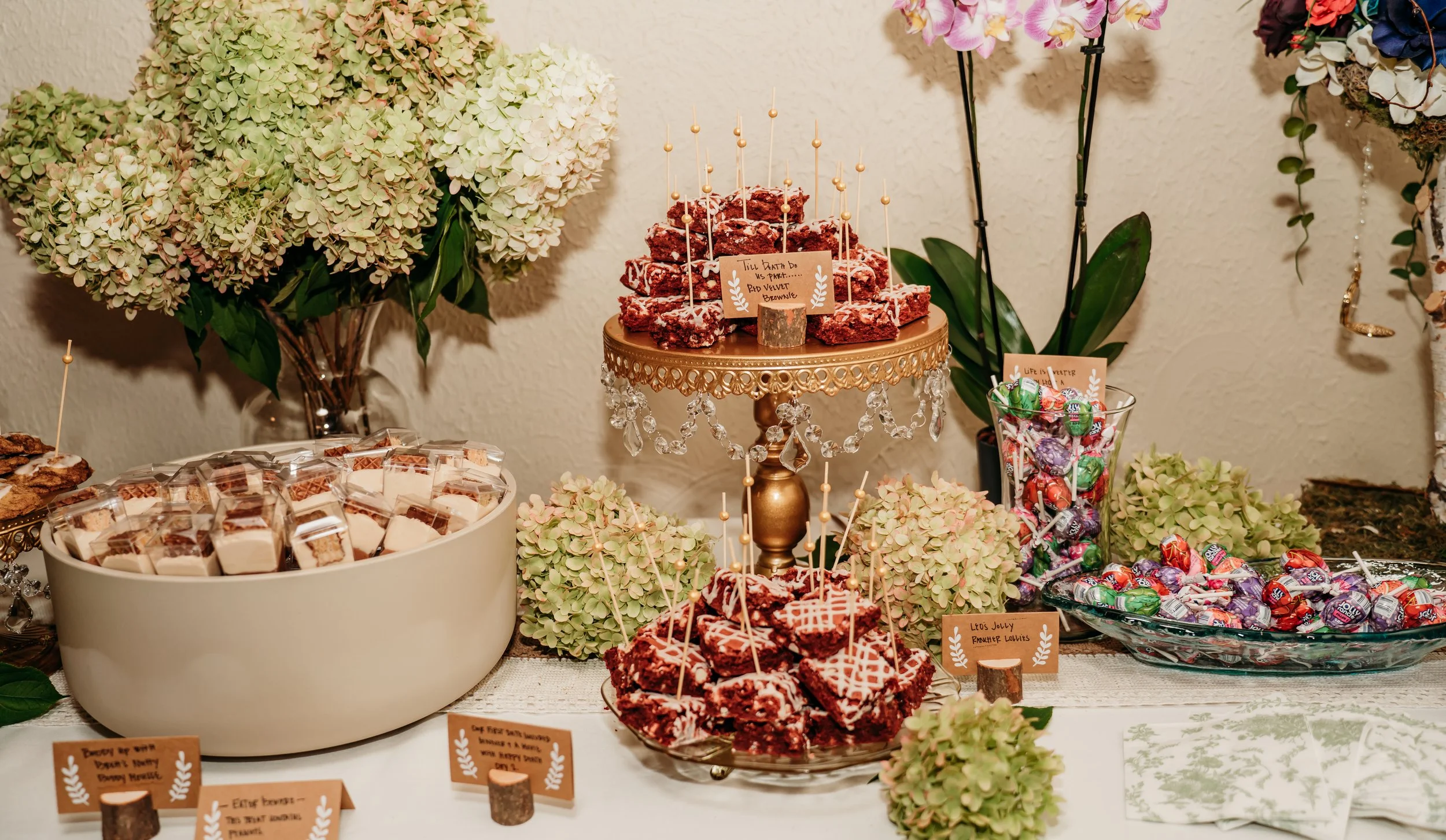 The table setup was stunning, featuring gold stands, fresh hydrangeas and orchids, and charming wooden signs that created a cohesive and elegant look. Their design belongs in a magazine. They handled the setup and take-down, which took so much stress off our plates. Guests couldn't stop talking about how beautiful (and delicious!) everything was; people were asking for business cards all night!